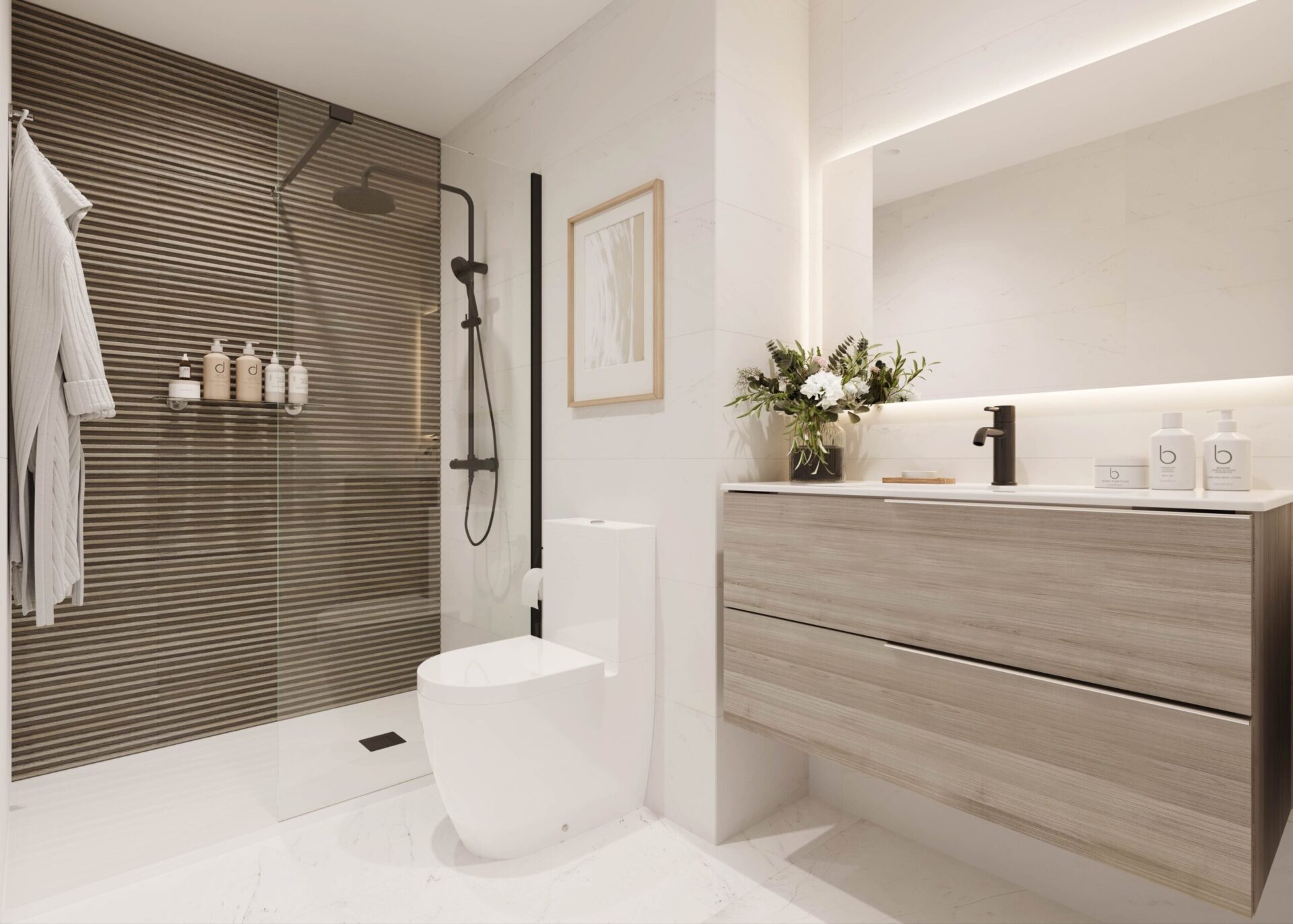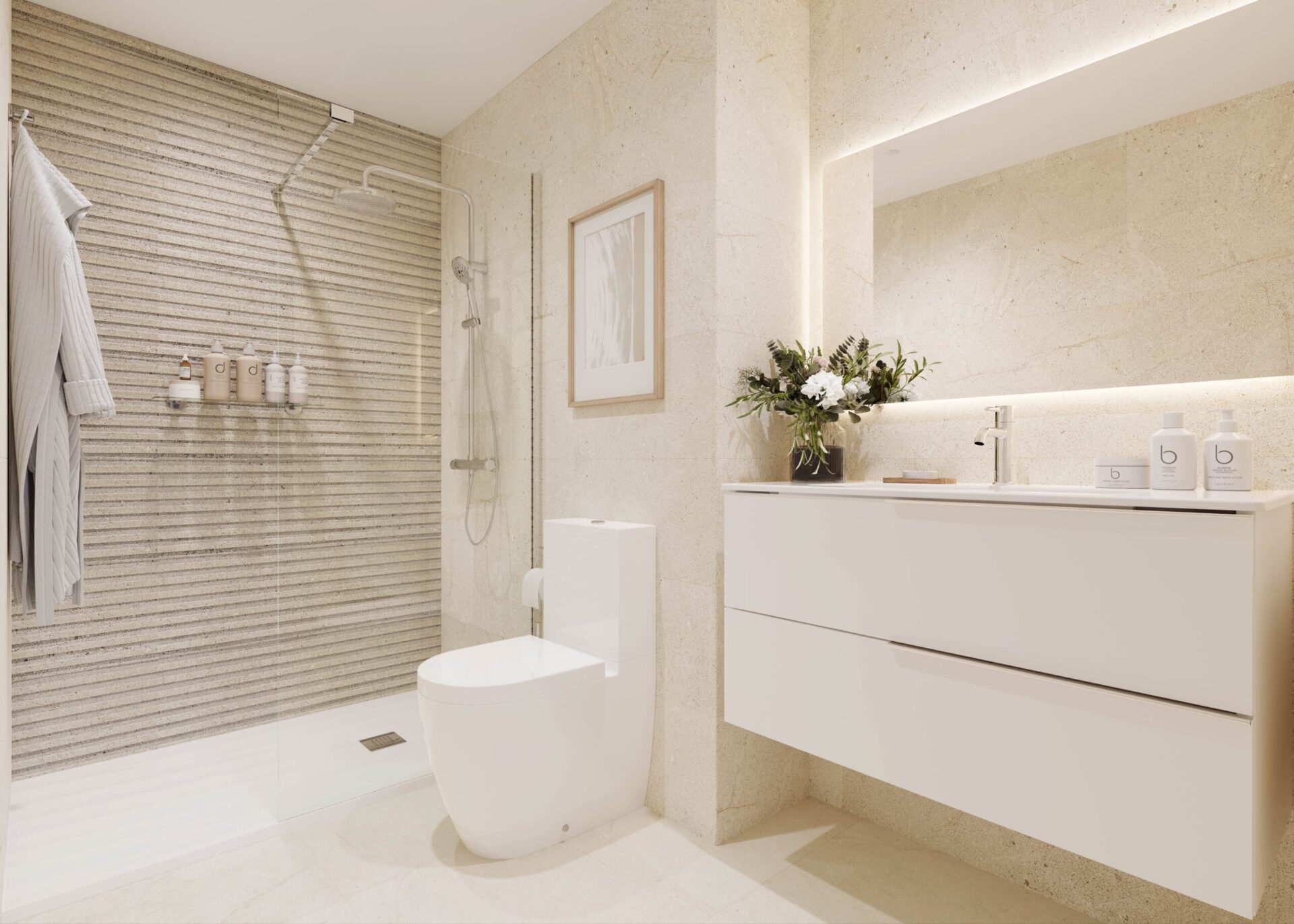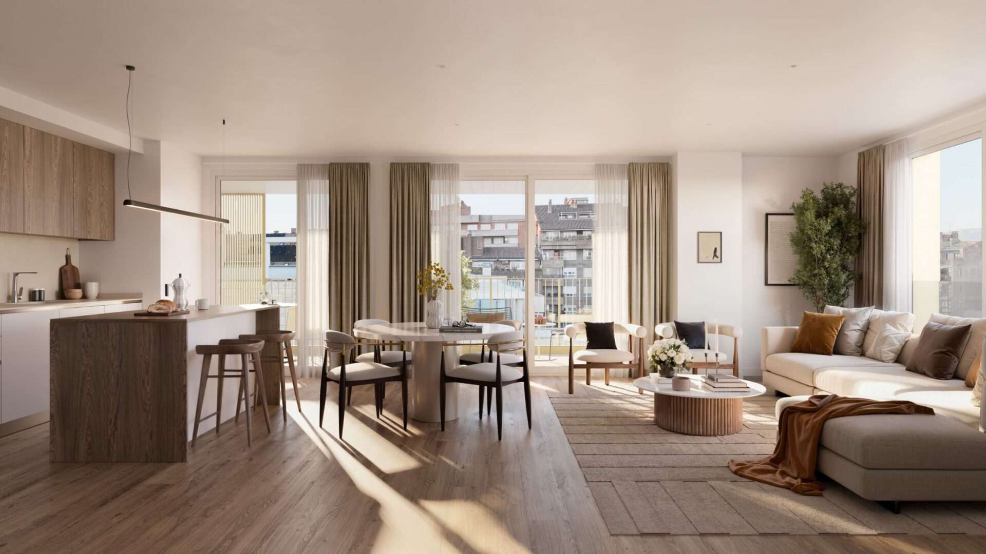 Viviendas de 2, 3 y 4 dormitorios que cuentan con todas las comodidades necesarias para disfrutar al máximo de tu hogar, con amplios salones que comunican directamente con la cocina y espaciosas terrazas que pueden disfrutarse durante todo el año.