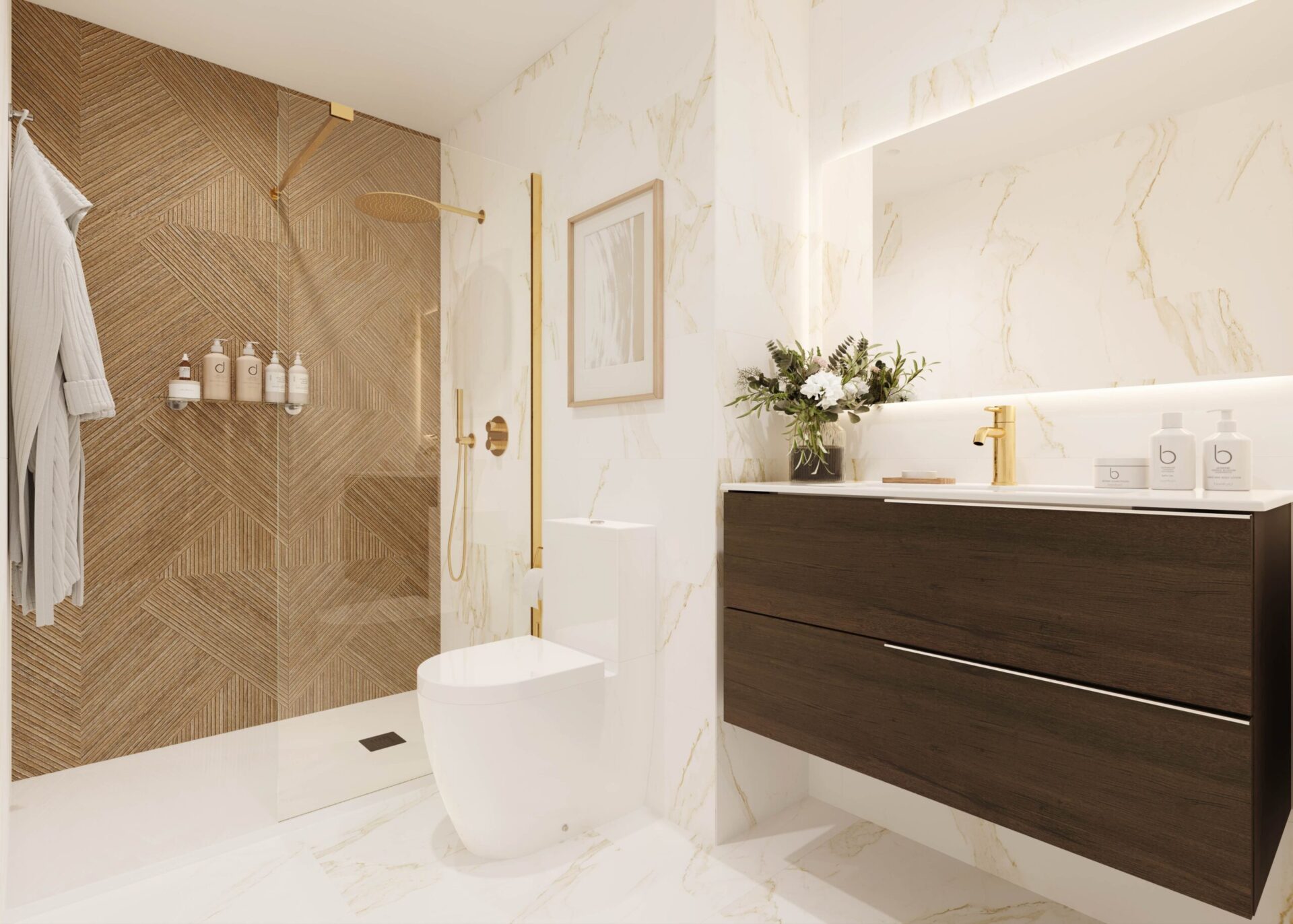 Contraste de texturas y acabados, utilizando materiales que interactúan entre sí, con acabados de efecto natural, como madera, piedra y hormigón, para crear una atmósfera de “lujo orgánico”.